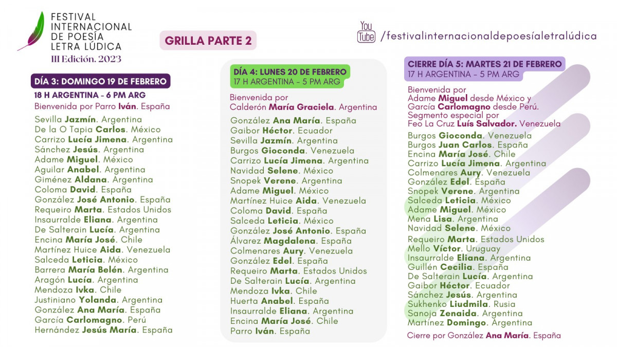 Su participación en esta edición consistirá en la lectura de dos poemas de su propia autoría los días 18 y 20, el saludo inicial de bienvenida a los participantes el día 19 y la presentación mundial de su poemario “Sueños rotos” también ese mismo día 19. Todas las sesiones del festival comenzarán a partir de las 21 horas de España (17 horas de Argentina).